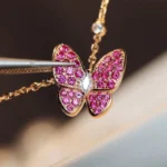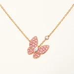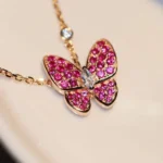 This butterfly necklace features a delicate butterfly-shaped pendant designed with sparkling stones that enhance its elegant silhouette. The butterfly motif represents grace and transformation, while the shimmering surface adds a refined brilliance that catches light from different angles.