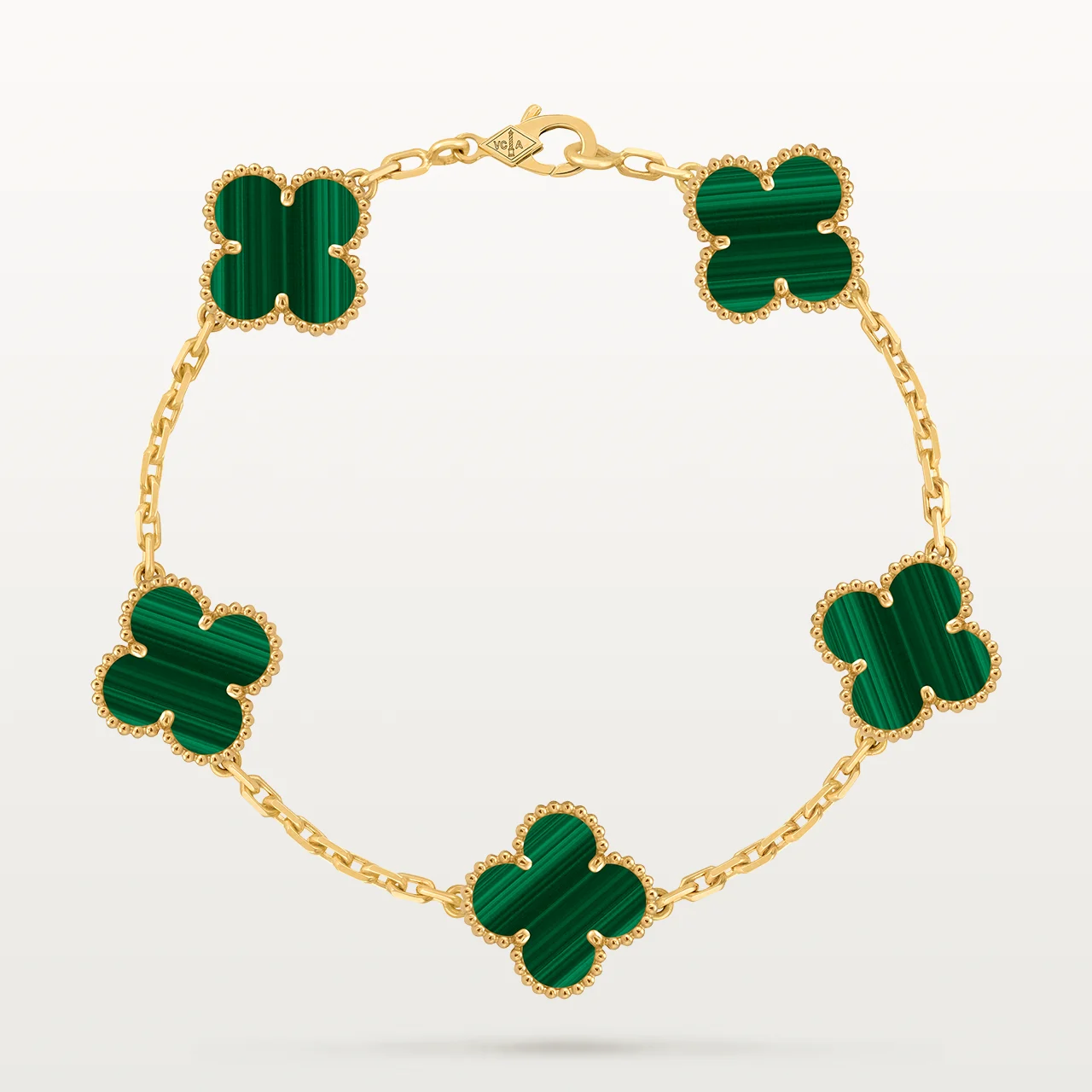 Clover Bracelet Yellow Gold Plated 5 Malachite Motifs High Quality