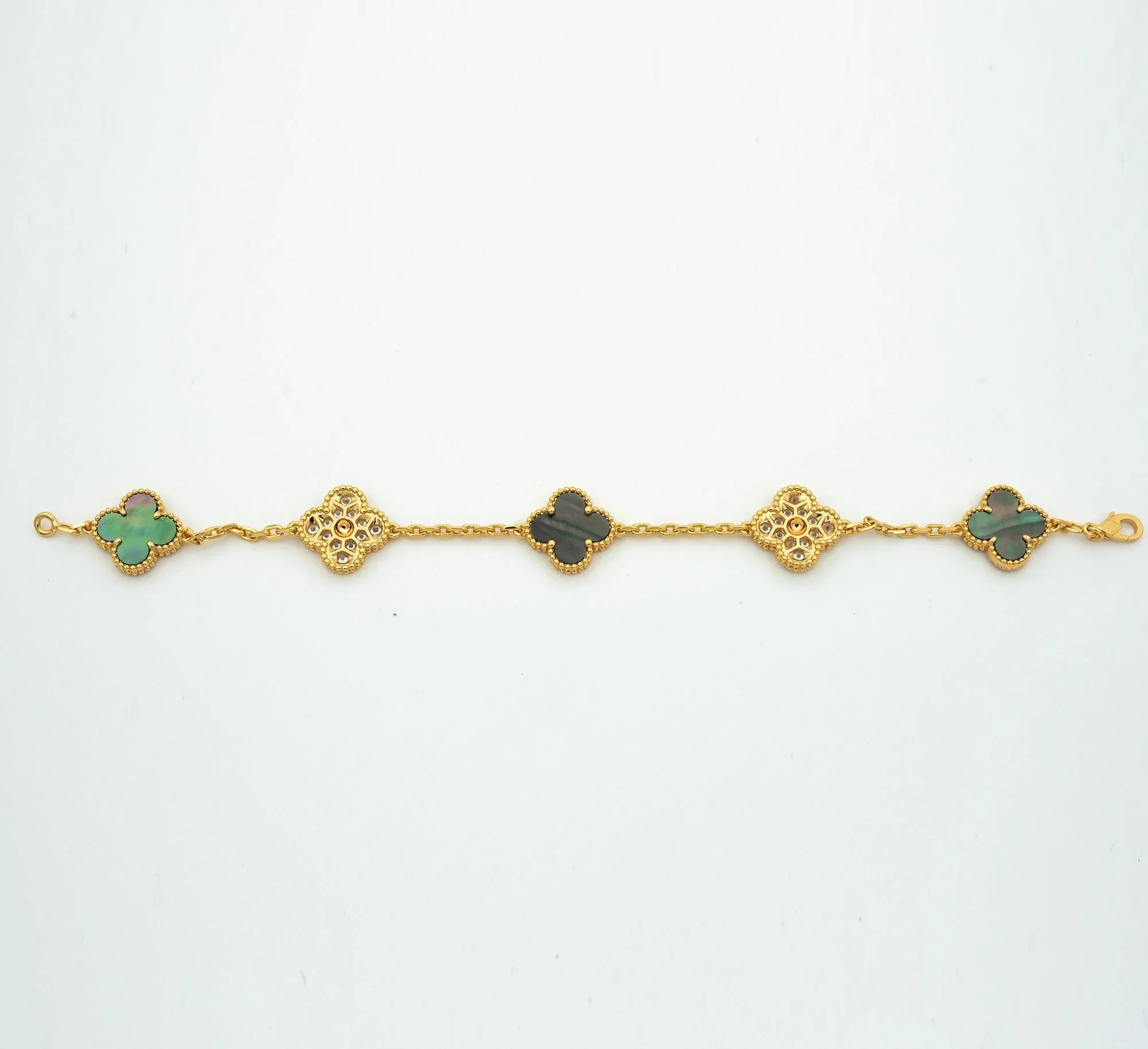 Add some luck to your wardrobe with our Clover Bracelet. Boasting 5 beautiful motifs of mother of pearl and sparkling diamonds, this piece is a symbol of fortune and elegance. Perfect for any occasion, let this bracelet bring some charm and style to your look.