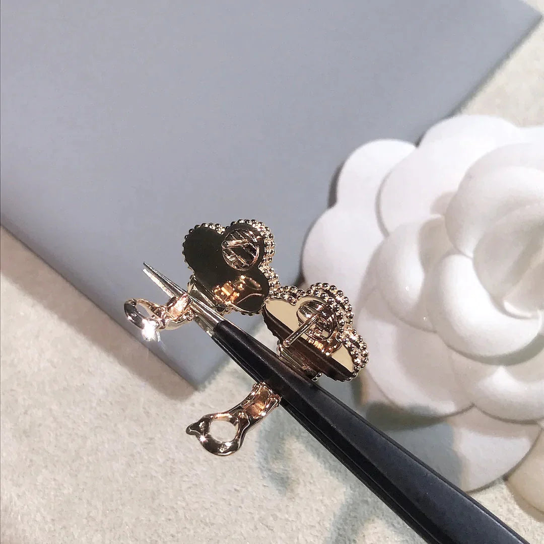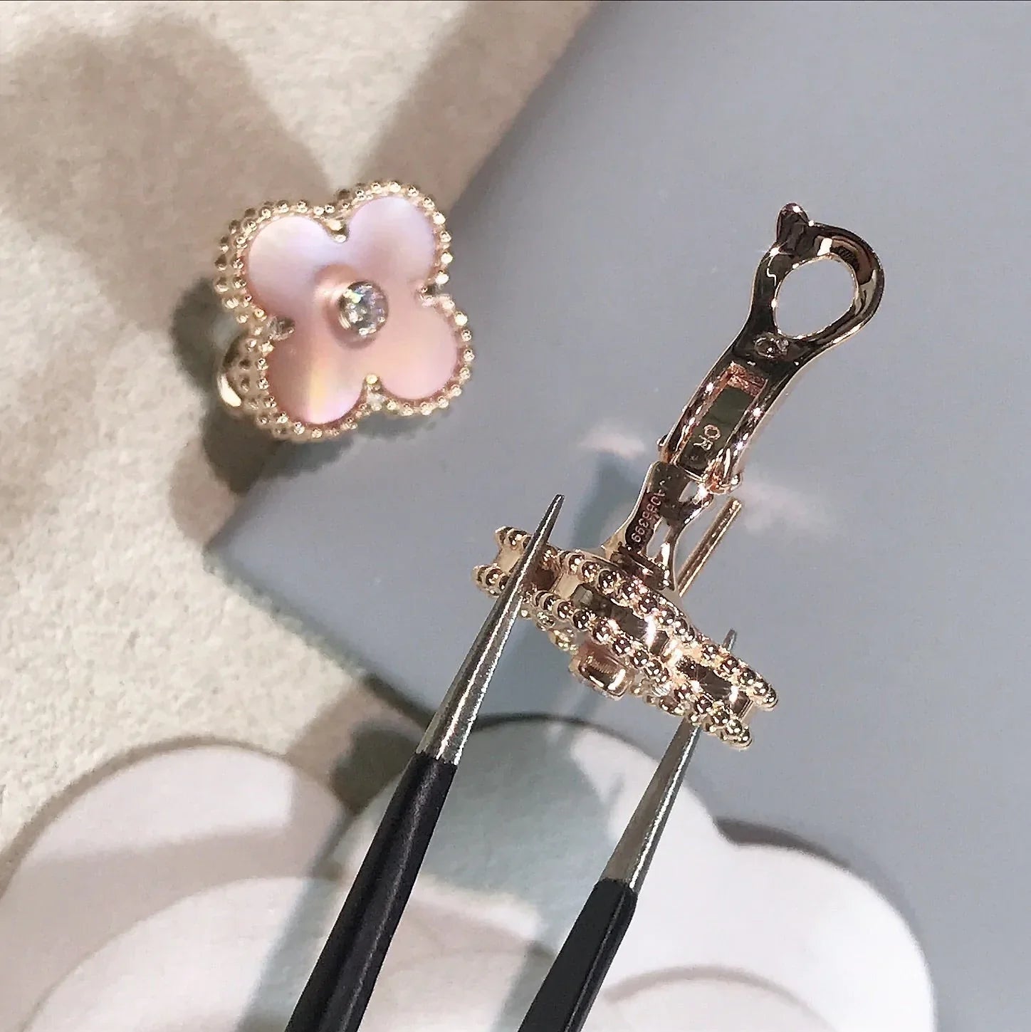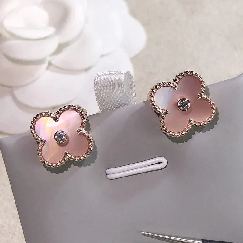 Clover Earrings Gold Pink Mother of Pearl Diamond Accent High Quality