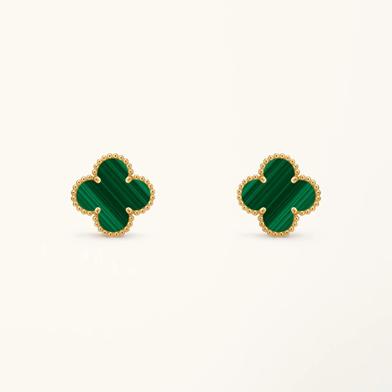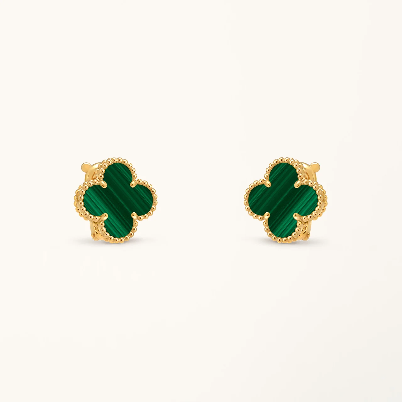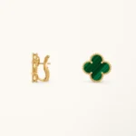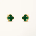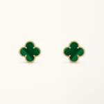 These clover earrings feature a medium-sized four-leaf clover motif set with malachite stone, framed in a yellow gold plated setting. The rich green tones and natural banded patterns of malachite create a distinctive contrast against the warm gold surface, highlighting the symmetry of the clover design while maintaining a clean and balanced appearance.