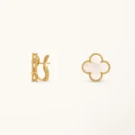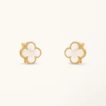 These clover earrings feature a medium-sized four-leaf clover motif inlaid with white mother of pearl, set within a yellow gold plated frame. The soft iridescent surface of the mother of pearl reflects light subtly, creating a gentle contrast with the warm gold tone while maintaining a clean and symmetrical clover design.