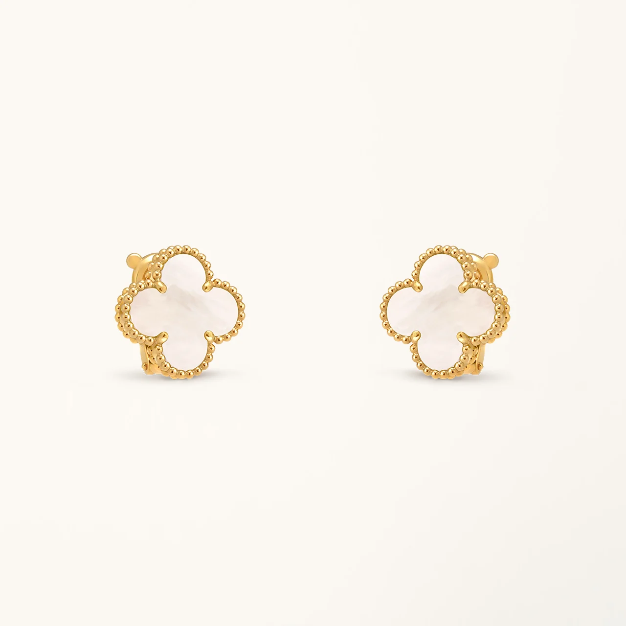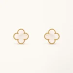 These clover earrings feature a medium-sized four-leaf clover motif inlaid with white mother of pearl, set within a yellow gold plated frame. The soft iridescent surface of the mother of pearl reflects light subtly, creating a gentle contrast with the warm gold tone while maintaining a clean and symmetrical clover design.