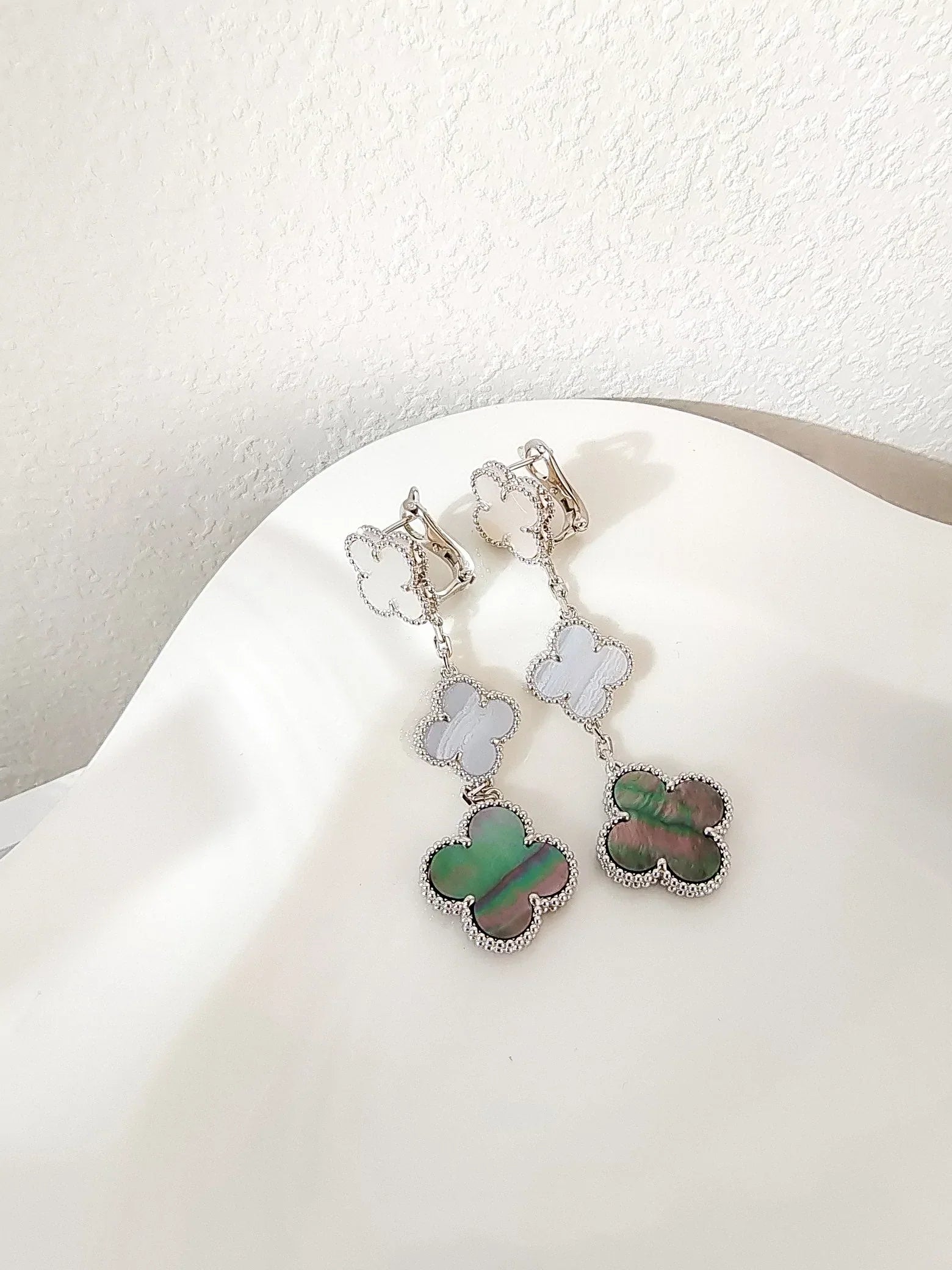 Clover Earrings Silver Chalcedony Dark MOP 3 Motifs Dangle High Quality