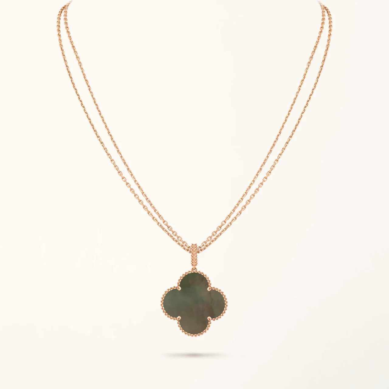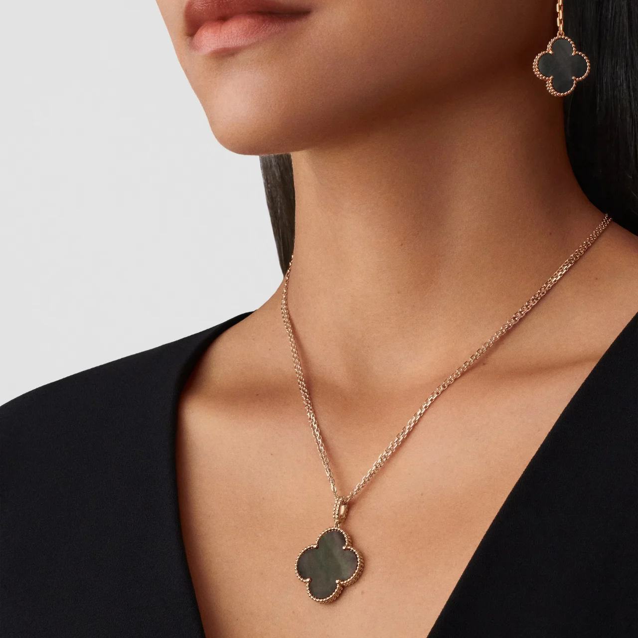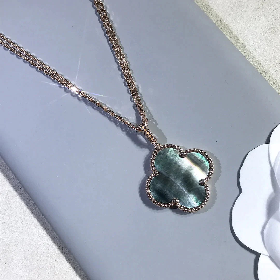 This clover necklace features a large four-leaf clover pendant crafted with dark mother of pearl inlay set within a rose gold plated frame. The natural iridescence of the dark MOP surface creates subtle reflections that contrast with the warm tone of the metal, highlighting the symmetrical clover motif while maintaining a clean and structured appearance. The pendant is suspended from a fine chain that rests naturally along the neckline.