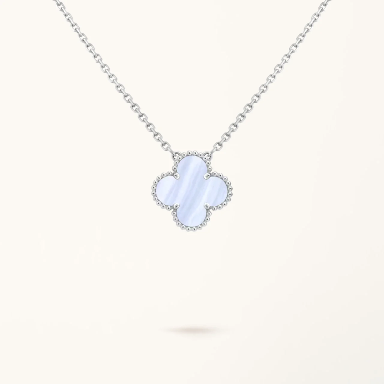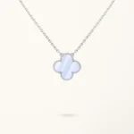 Crafted from 925 sterling silver, the necklace offers a durable structure with a smooth polished surface. The chalcedony stone adds gentle color and visual depth to the clover design, while the lightweight chain ensures comfortable wear for everyday styling.