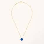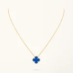 This clover necklace features a four-leaf clover pendant set with blue agate stone, framed in a yellow gold plated setting. The deep blue tone of the agate creates a strong visual contrast against the warm gold surface, enhancing the symmetry of the clover motif while maintaining a clean and balanced design. The pendant is suspended from a fine chain that allows it to rest naturally along the neckline.