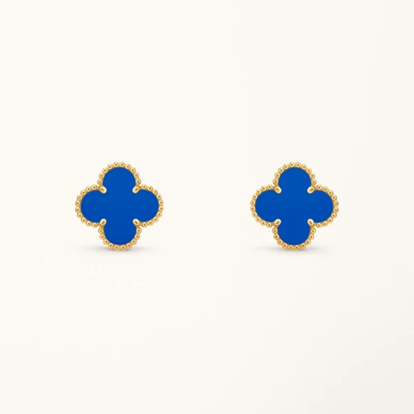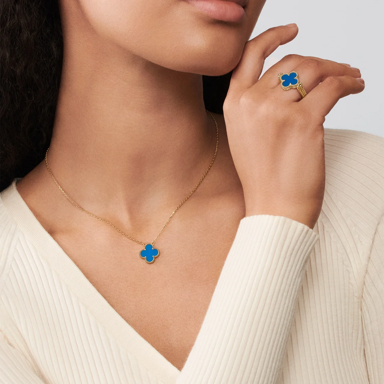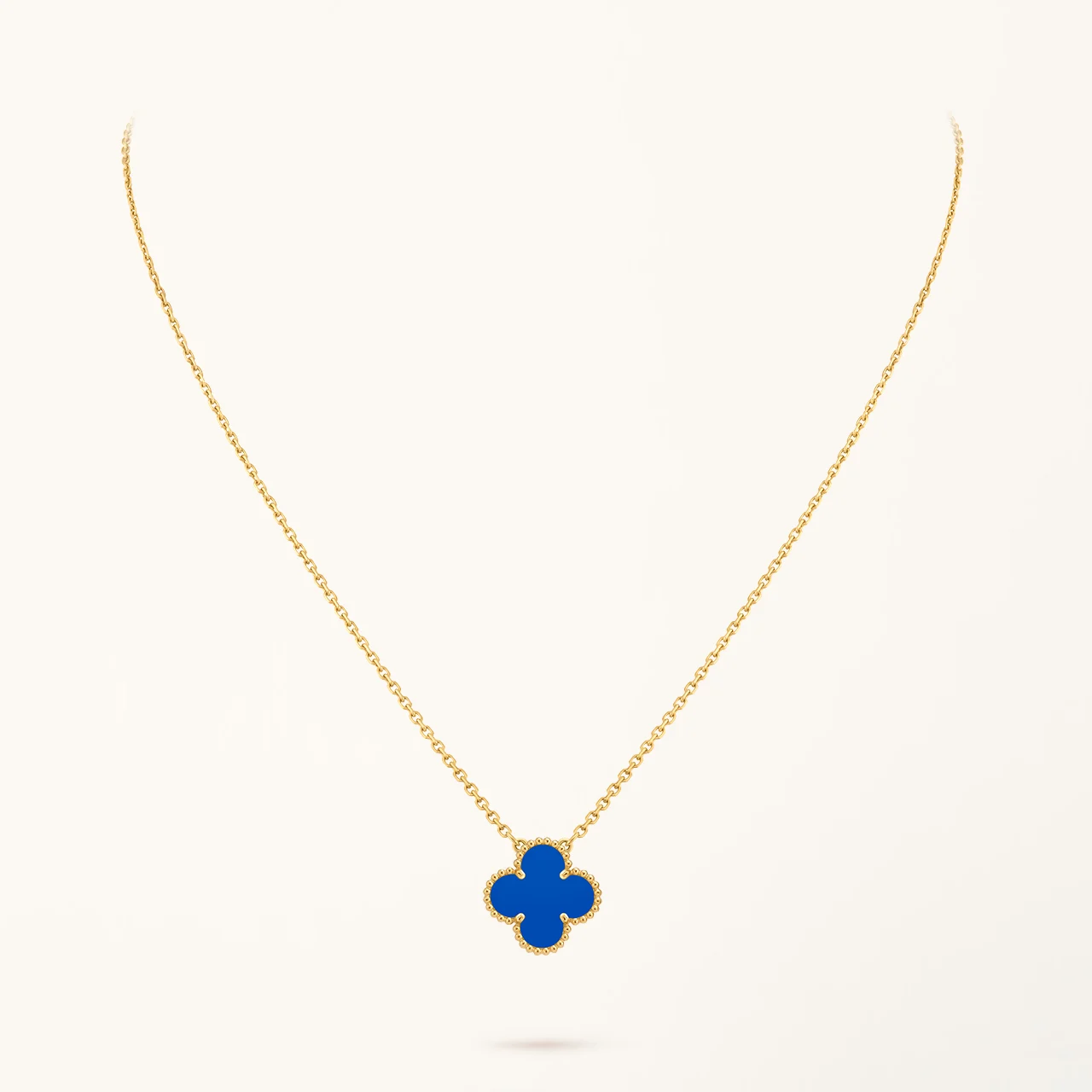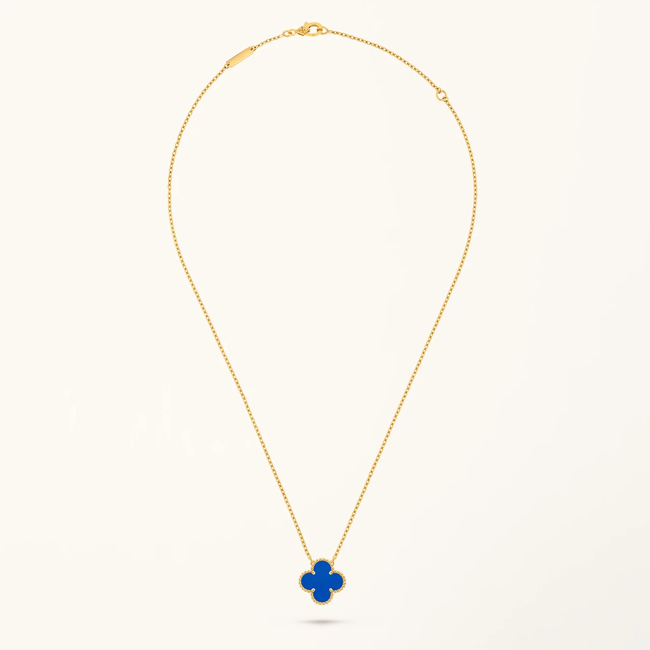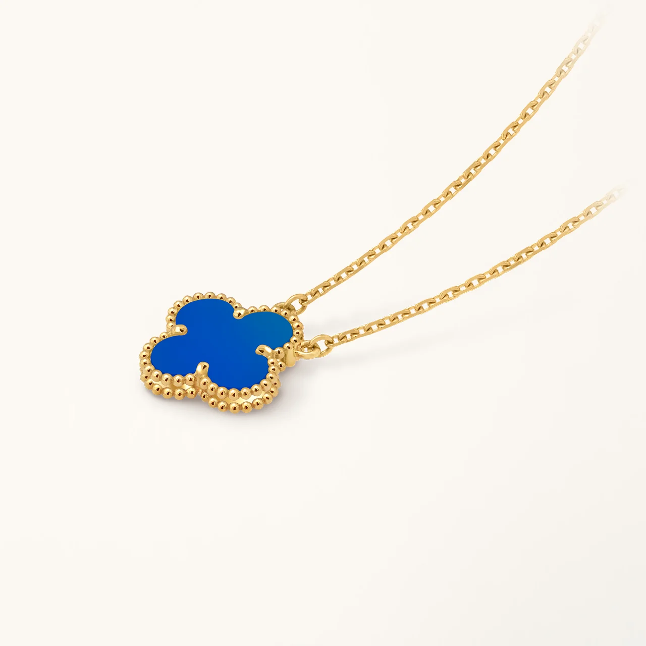 This clover necklace features a four-leaf clover pendant set with blue agate stone, framed in a yellow gold plated setting. The deep blue tone of the agate creates a strong visual contrast against the warm gold surface, enhancing the symmetry of the clover motif while maintaining a clean and balanced design. The pendant is suspended from a fine chain that allows it to rest naturally along the neckline.