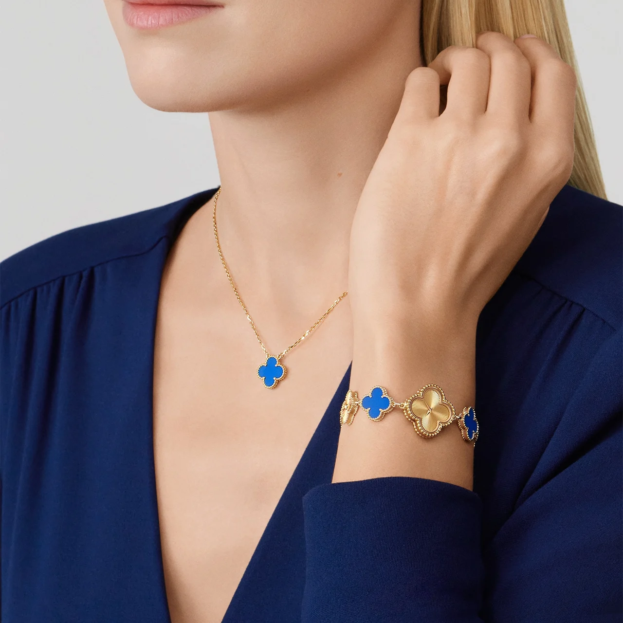 Clover Necklace Yellow Gold Plated Blue Agate Motif High Quality