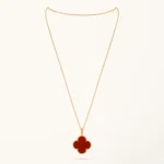 This clover necklace features a four-leaf clover pendant crafted with a polished carnelian inlay set within a yellow gold plated frame. The warm orange-red tone of the carnelian creates a natural contrast against the gold finish, highlighting the symmetrical clover motif while maintaining a clean and balanced design. The pendant is suspended from a fine chain that allows it to rest naturally along the neckline.