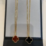 Made from 925 sterling silver with an 18k yellow gold plated surface, the necklace combines durability with a smooth polished appearance. The carnelian clover motif adds subtle color and visual depth, while the lightweight chain ensures comfortable daily wear.