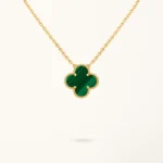 This clover necklace features a four-leaf clover pendant set with malachite stone, framed in a yellow gold plated setting. The rich green tones and natural banded patterns of malachite create a distinctive visual contrast against the warm gold surface, highlighting the symmetry of the clover motif while maintaining a clean and balanced design. The pendant is suspended from a fine chain that allows it to rest naturally along the neckline.
