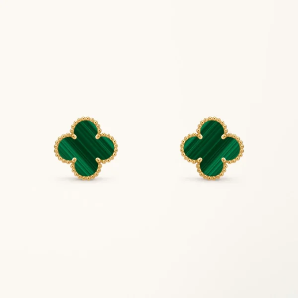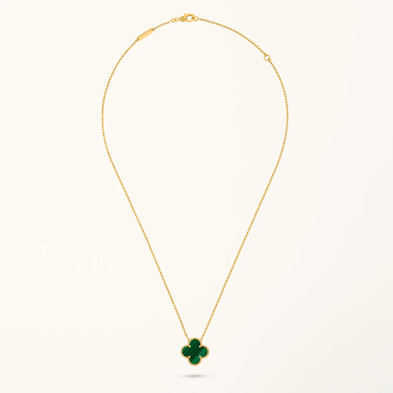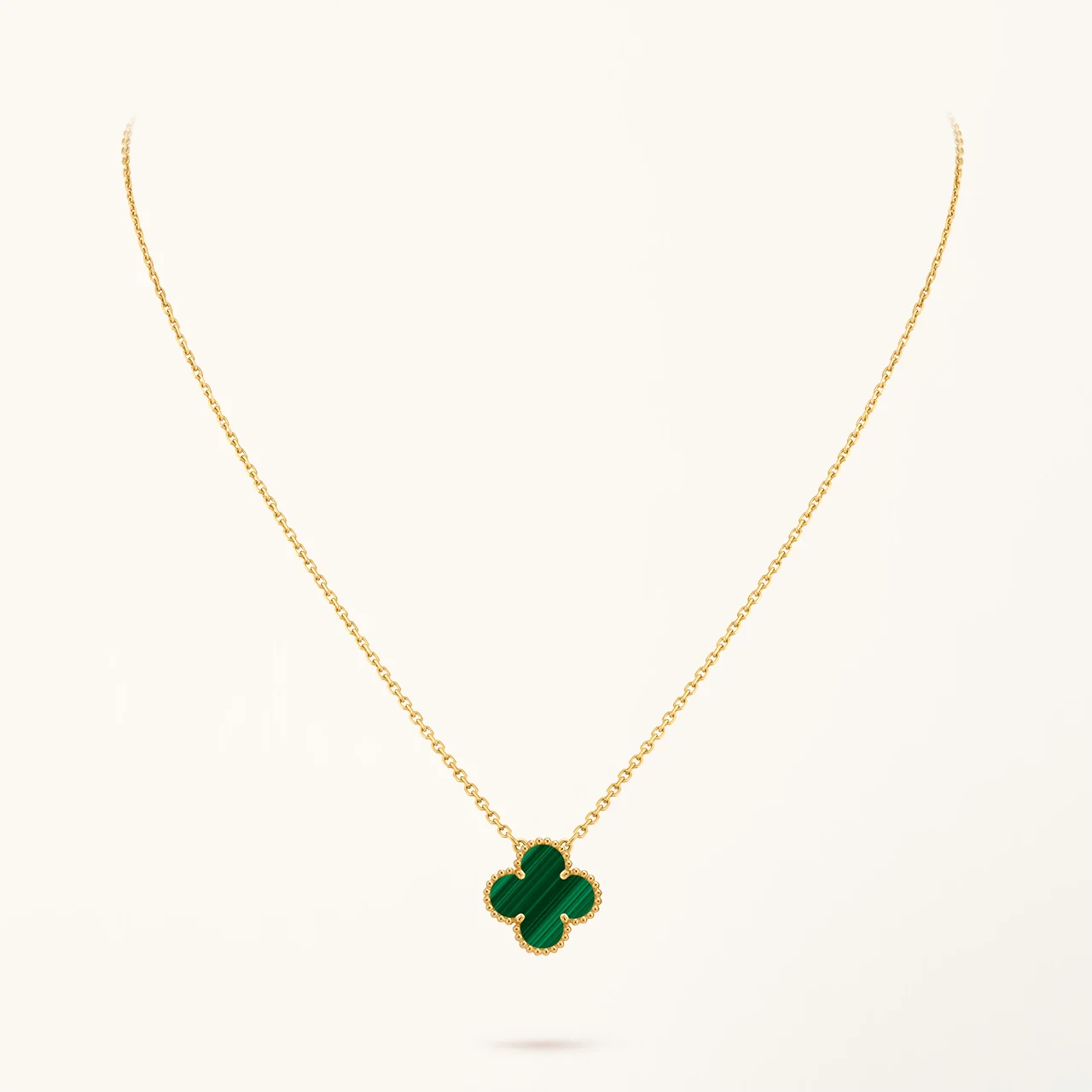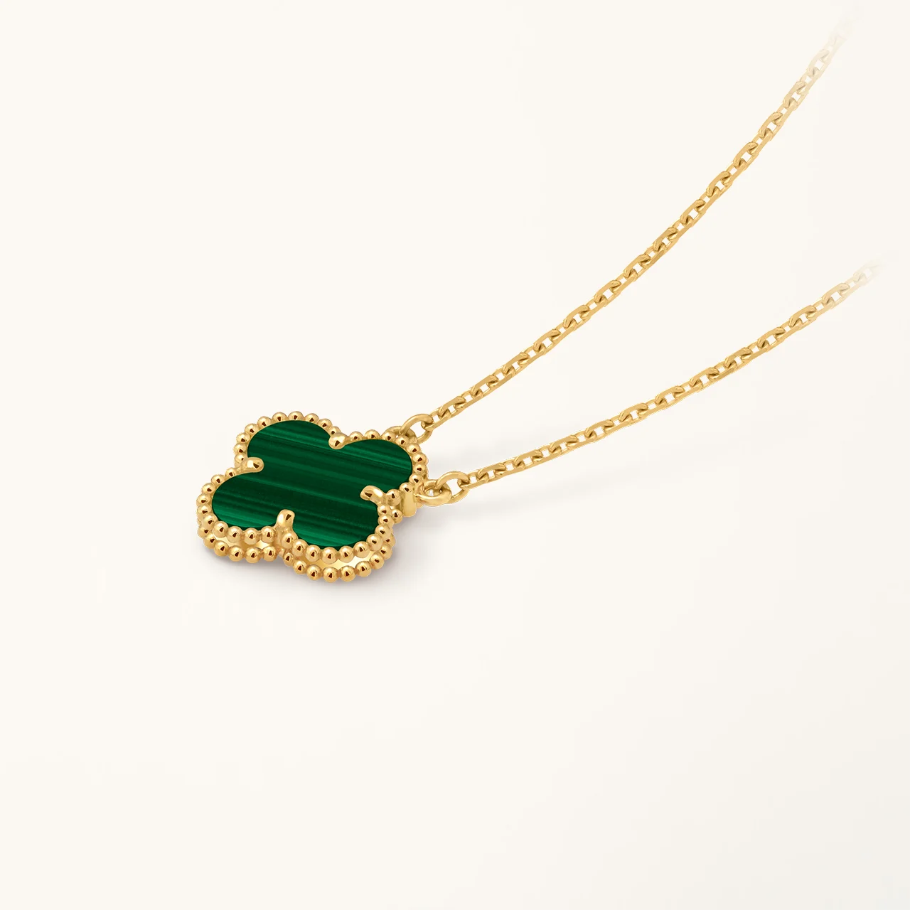 This clover necklace features a four-leaf clover pendant set with malachite stone, framed in a yellow gold plated setting. The rich green tones and natural banded patterns of malachite create a distinctive visual contrast against the warm gold surface, highlighting the symmetry of the clover motif while maintaining a clean and balanced design. The pendant is suspended from a fine chain that allows it to rest naturally along the neckline.