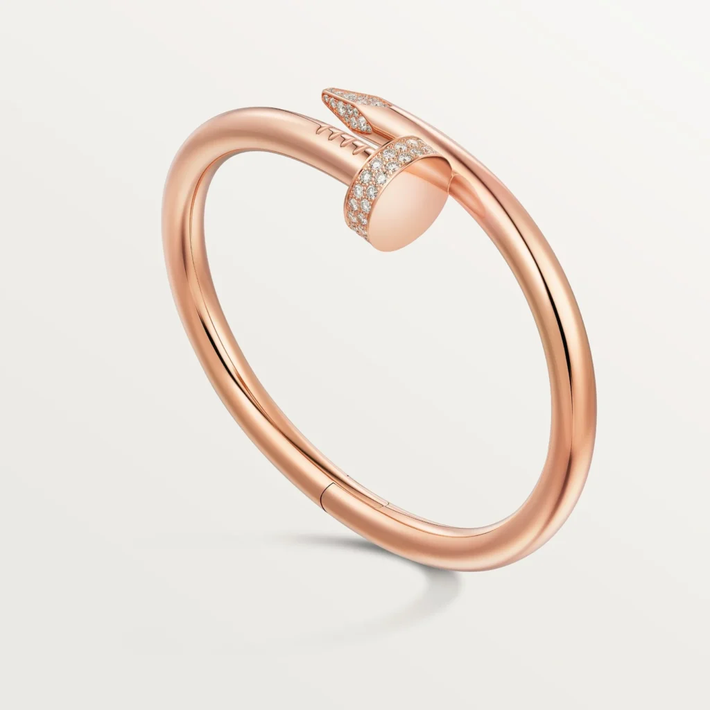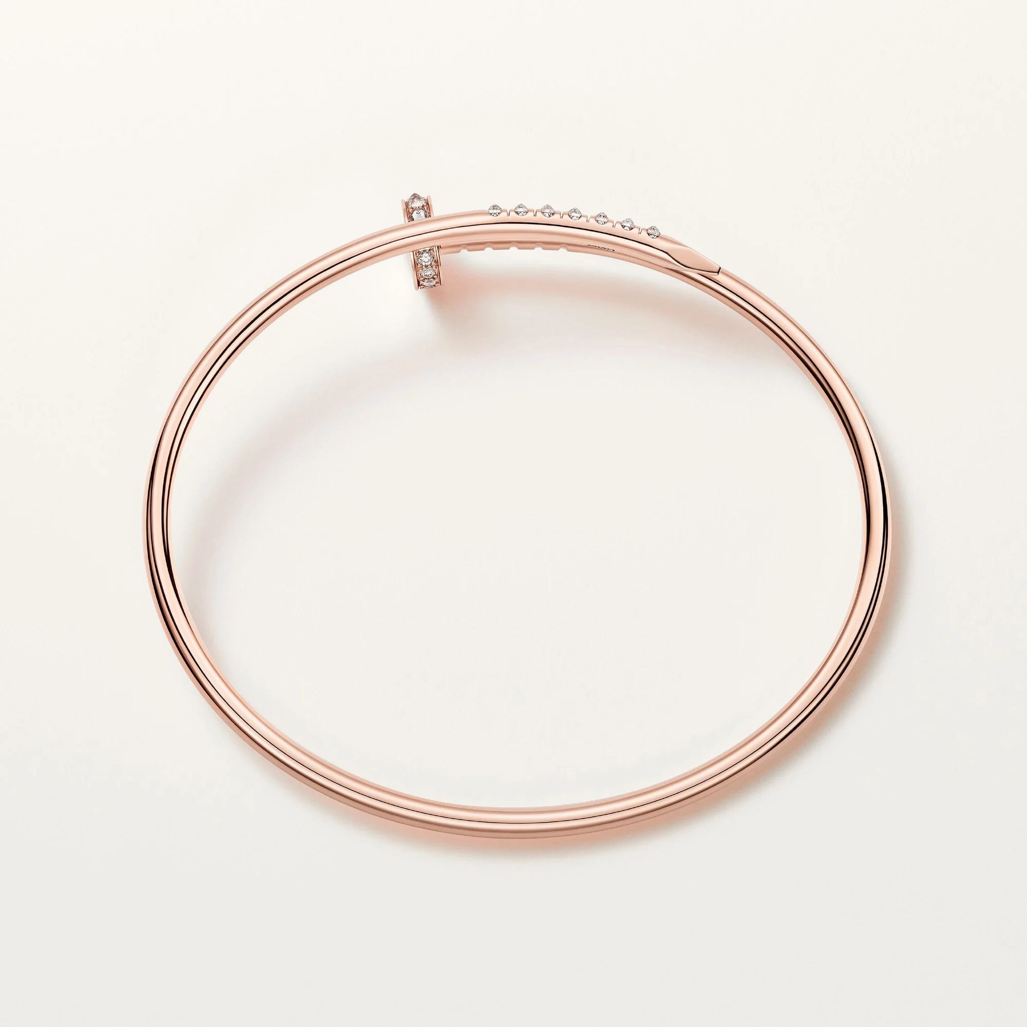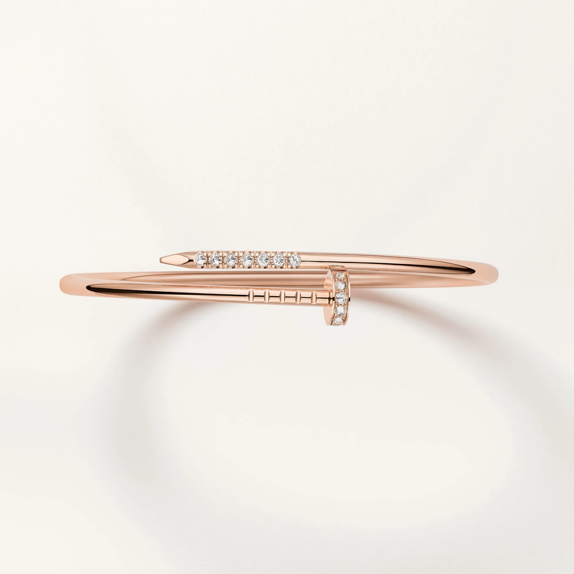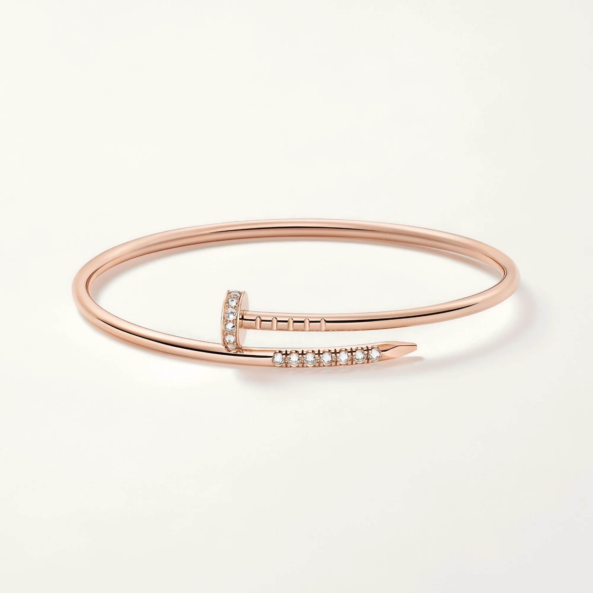 The Nail Design Bracelet Rose Gold Reverse Set Diamond – Small Model features a clean bangle silhouette inspired by the industrial nail form. The bracelet is finished in a polished rose gold tone and accented with reverse-set stones that follow the curve of the nail head and tip. The design highlights the contrast between the smooth metal surface and the precise stone placement.