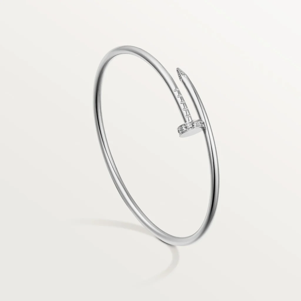 The minimal nail silhouette allows the bracelet to be worn individually or combined with other slim bangles. Its balanced proportions make it suitable for everyday wear while maintaining a refined jewelry appearance.