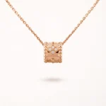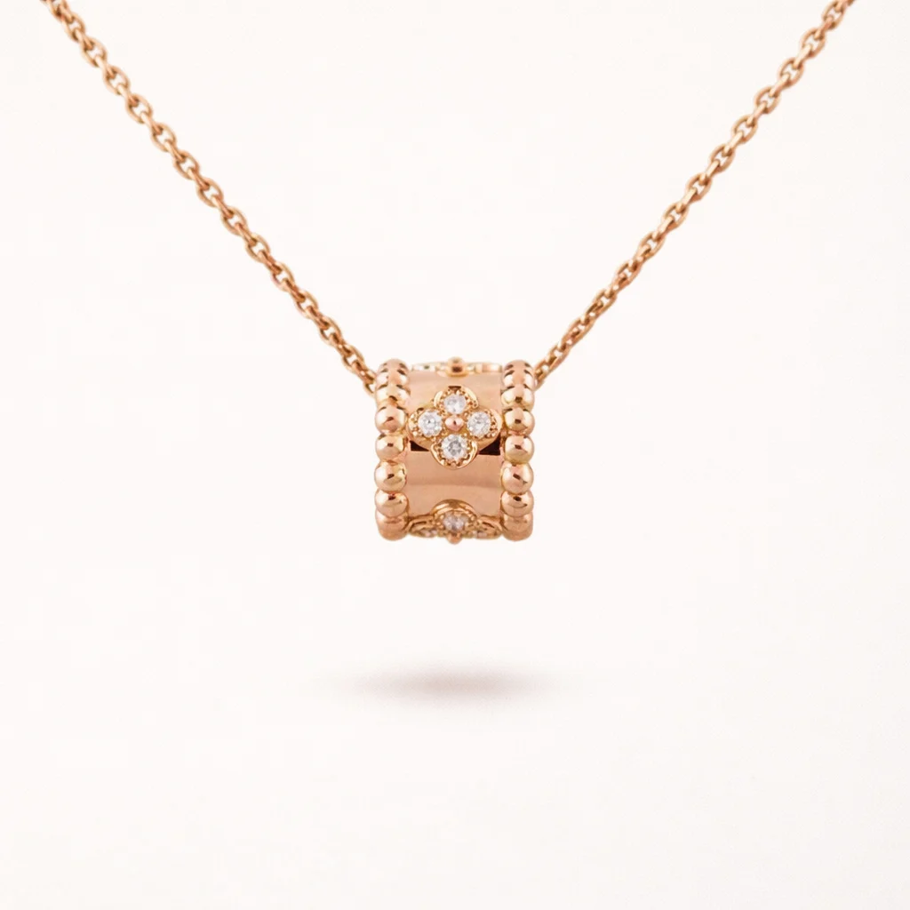 This Perlee necklace features a delicate beaded pendant design accented with a subtle clover detail. The rounded bead pattern forms a decorative border around the motif, creating a textured surface that highlights the clean geometric structure of the pendant. The design is suspended from a fine chain that allows the pendant to sit naturally along the neckline.