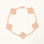 This clover bracelet features five elegant clover motifs accented with sparkling stones that add brilliance to the design. The polished rose gold plated finish enhances the delicate structure of the motifs, creating a refined and sophisticated appearance.